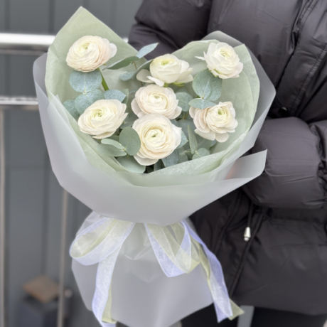 Ранункулюсы универсальны: они гармонично смотрятся в лаконичных моно-букетах и роскошных авторских композициях. Цветы прекрасно сочетаются с розами, пионовидными сортами, эустомами, гортензиями и эвкалиптом, придавая каждому букету стиль и элегантность.