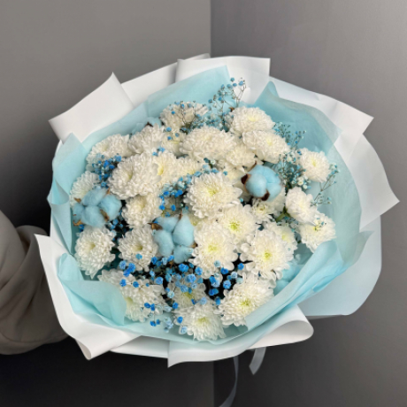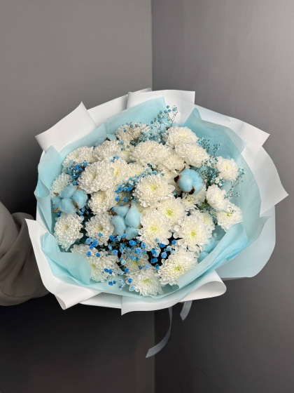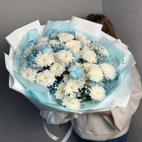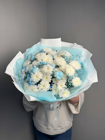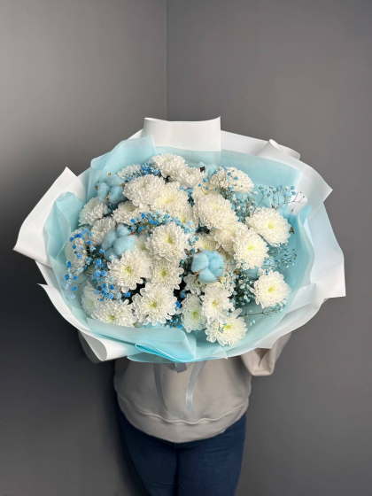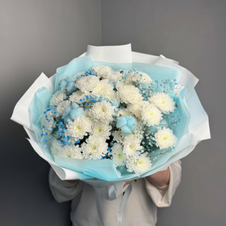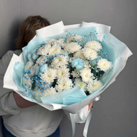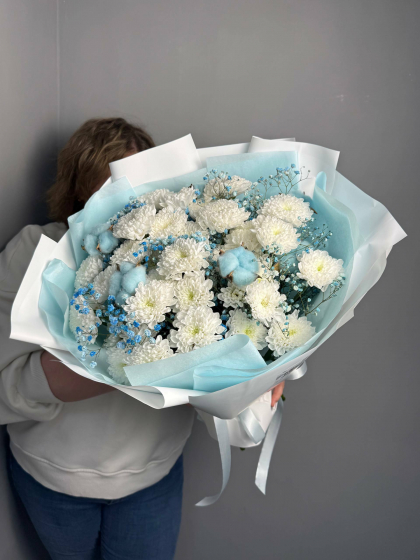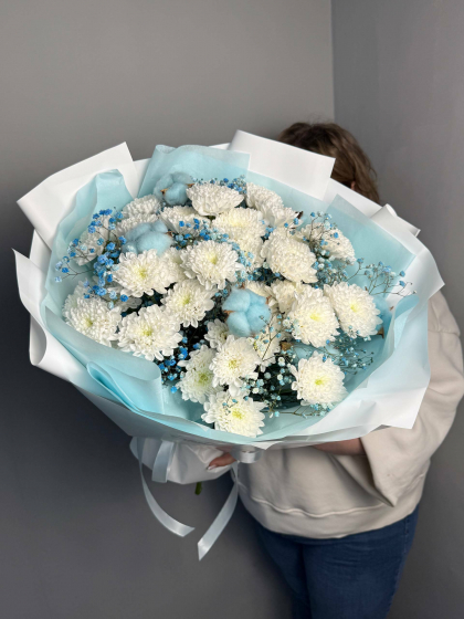 Букет из хризантем и гипсофилы «Просто чтобы ты улыбнулась» голубой "XL"