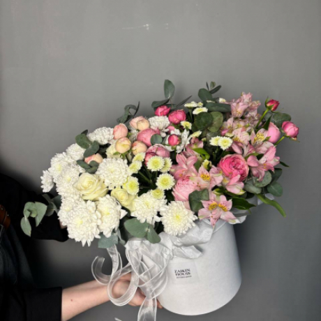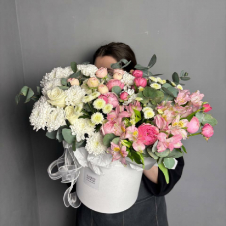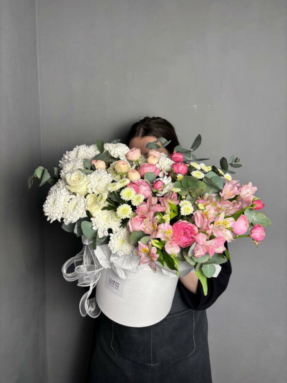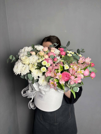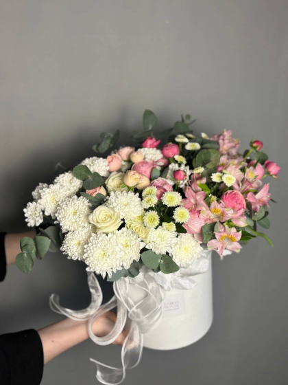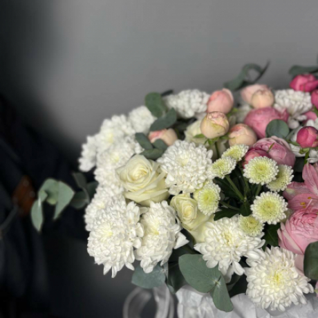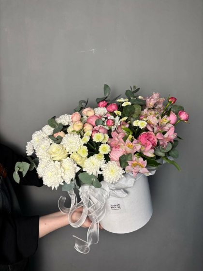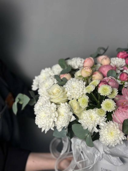 Сборная композиция с розами, хризантемами и альстромерией